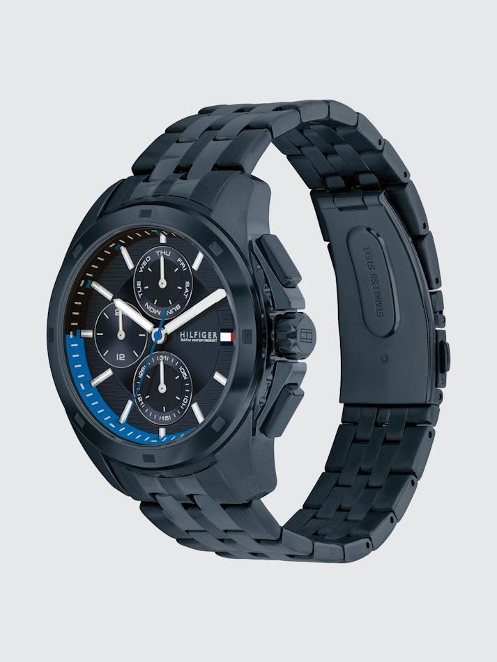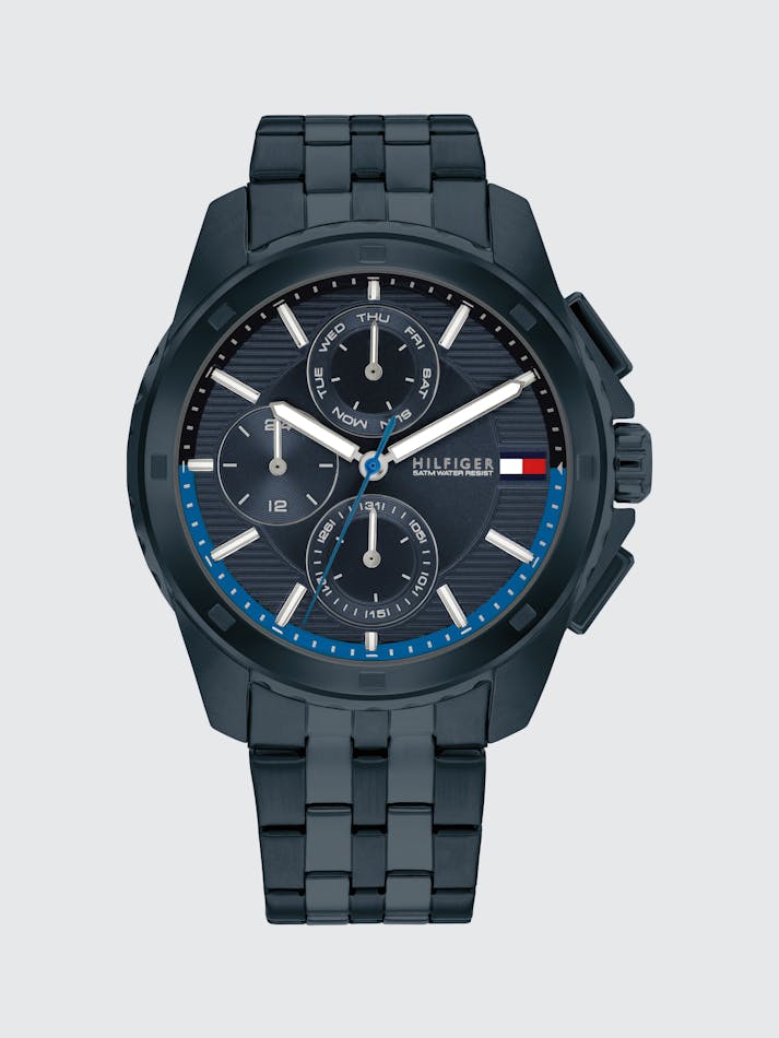 Introducing the men’s watch that transcends timekeeping to become an elevated masterpiece inspired by the dynamic pulse of the city. This metropolitan inspired timepiece features a Dimensional multi layer dial with a textured and sunray finish, CD cut sub eyes and TH branding elements throughout. Multifunction and offered in a bracelet or leather strap.