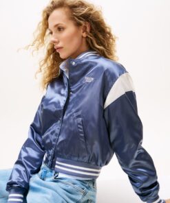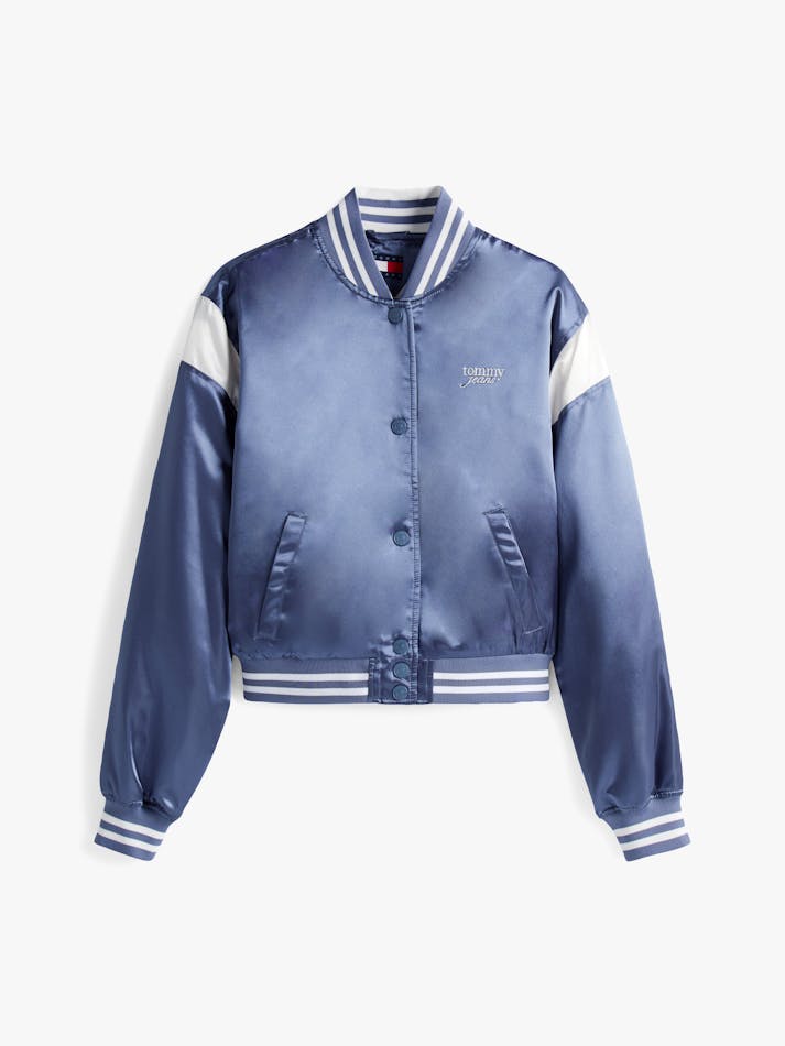 This satin bomber jacket gets top marks for varsity style, with its branded snap-button closure, baseball collar and stripe detailing.