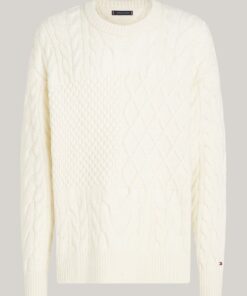 This wool-rich jumper features a mix of knits with a colour-blocked design on the front for a striking signature finish.