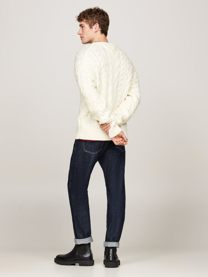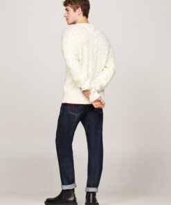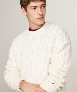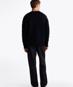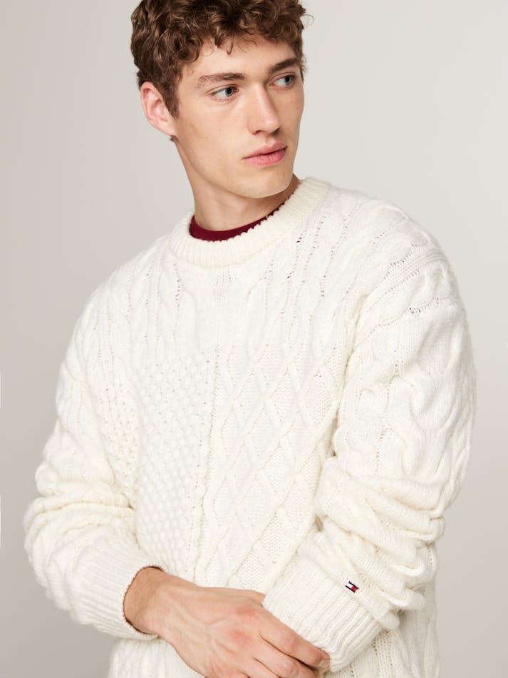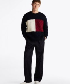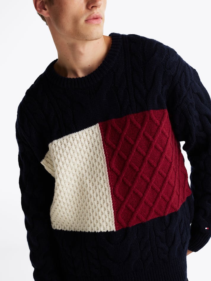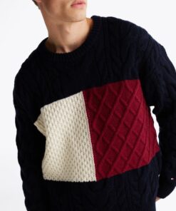 This wool-rich jumper features a mix of knits with a colour-blocked design on the front for a striking signature finish.